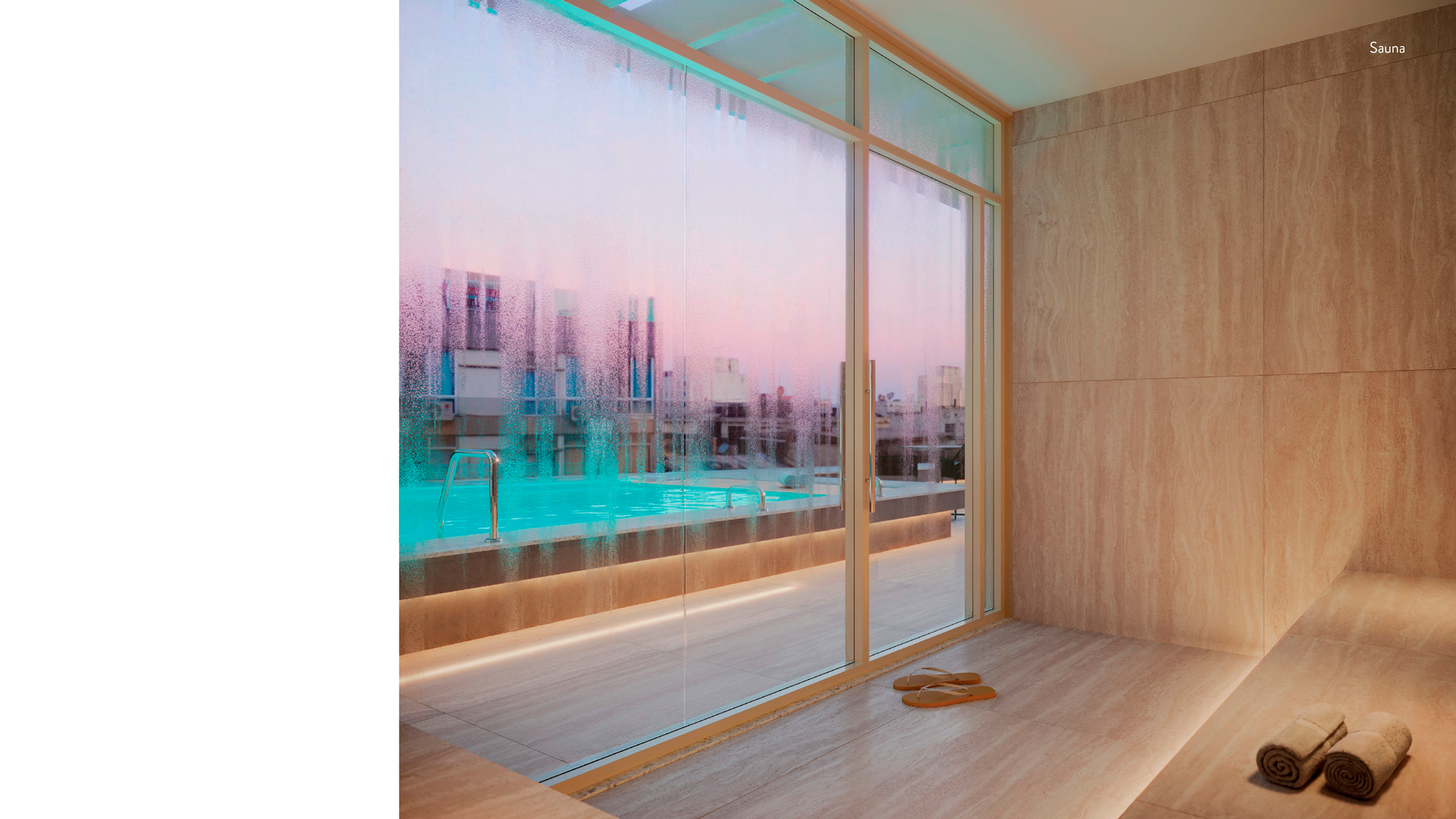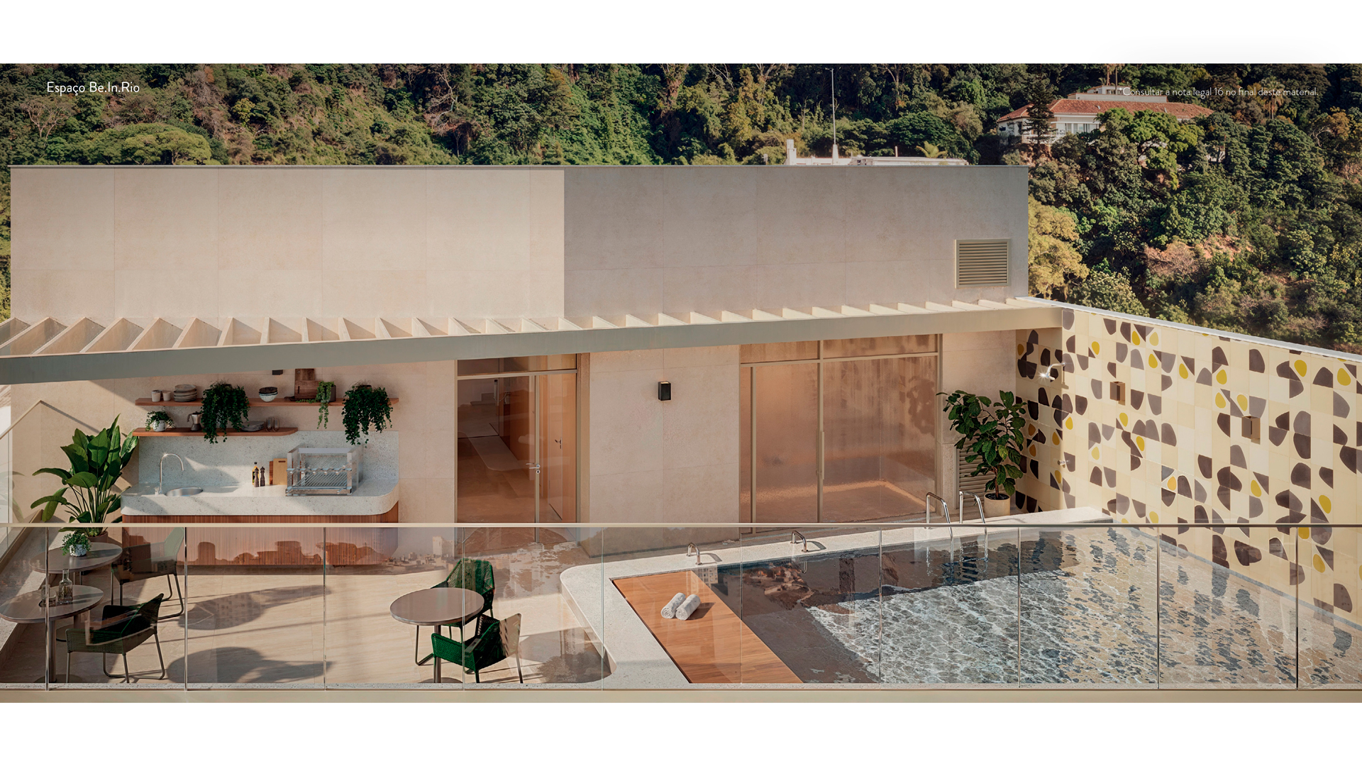 No topo do edifício, a área de lazer com piscina na cobertura se destaca como um refúgio urbano, um espaço concebido para momentos de descanso, socialização e contemplação.”