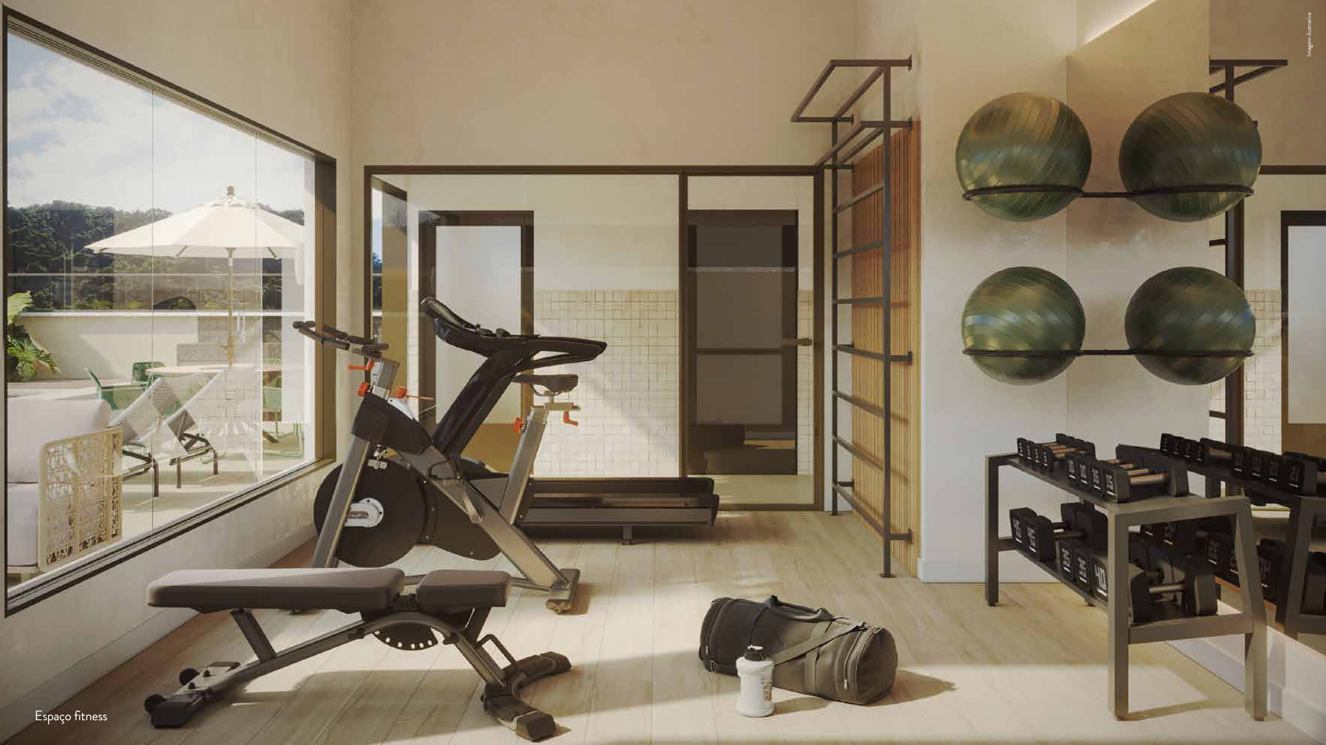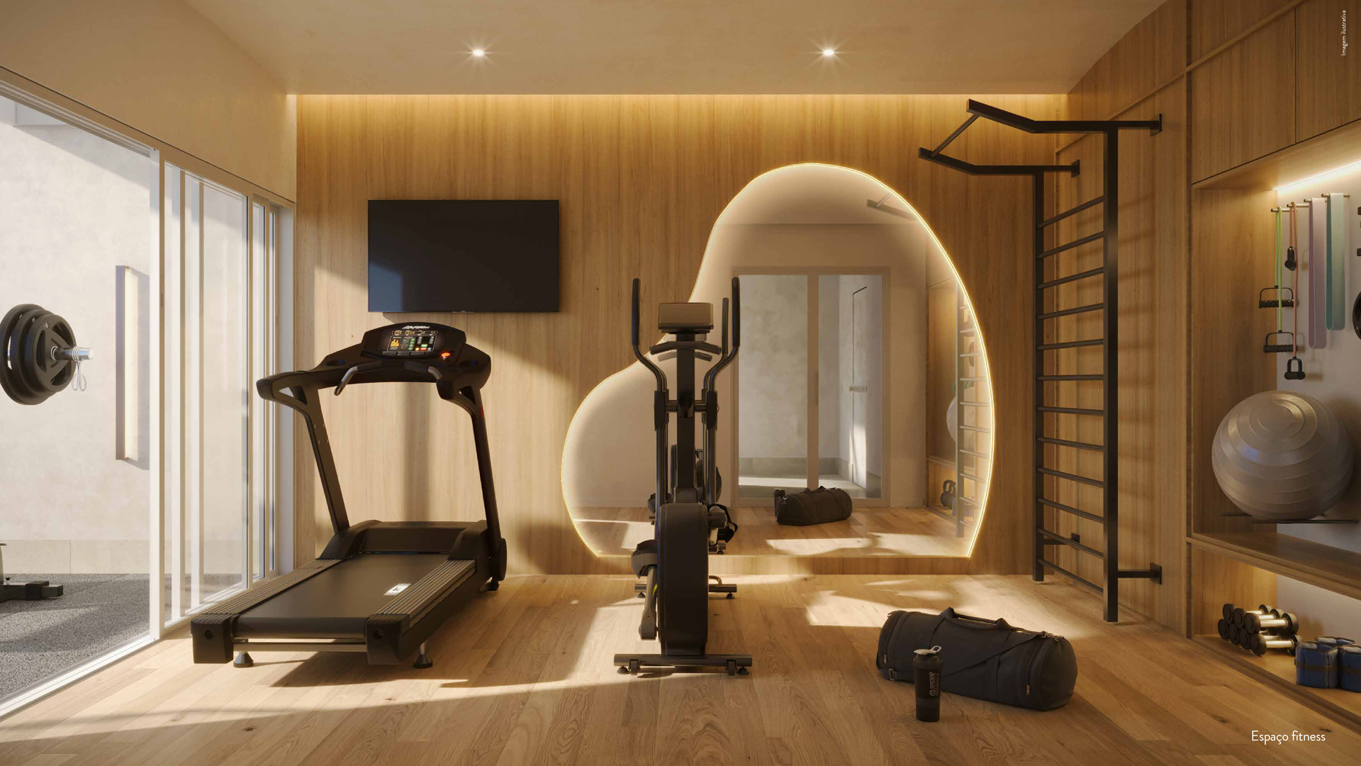 Buscando conforto e mais tranquilidade aos moradores, ambientes foram criados para trazer praticidade ao estilo de vida carioca, como espaço delivery, minimercado e espaço fitness, que estão totalmente inseridos no conceito do projeto. A aplicação da textura rústica e monolítica nas paredes e teto traz um contraste com a madeira utilizada em painéis e mobiliários contemplados em todo o interior.