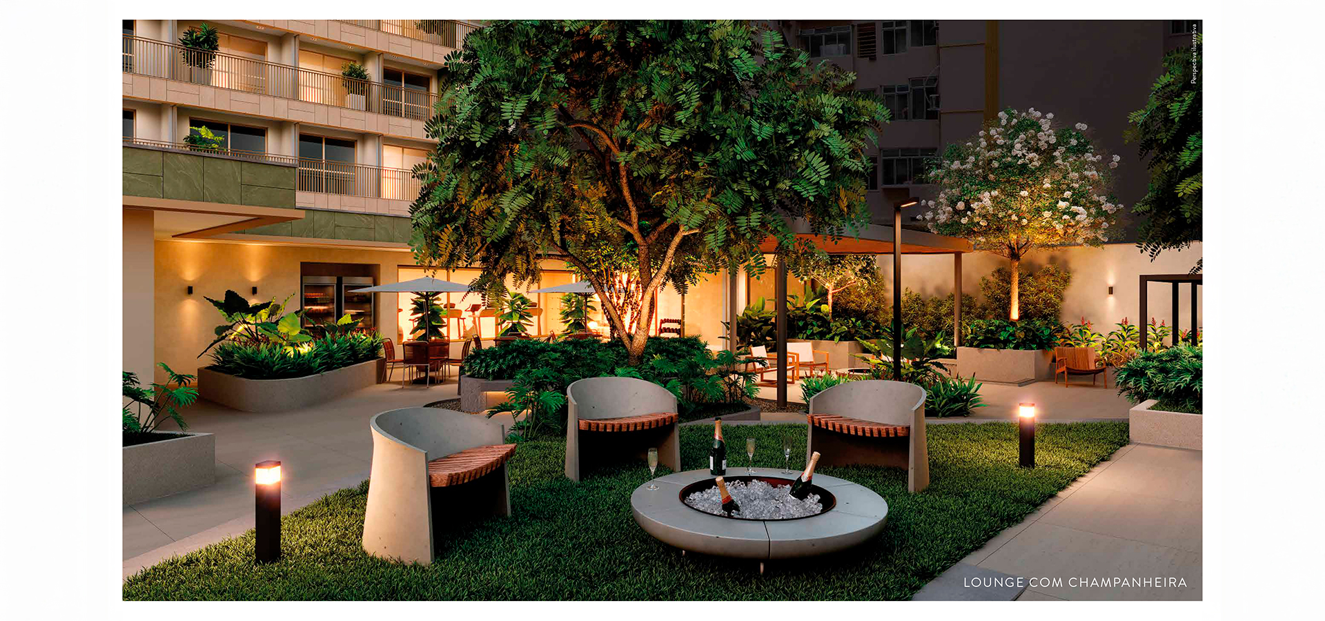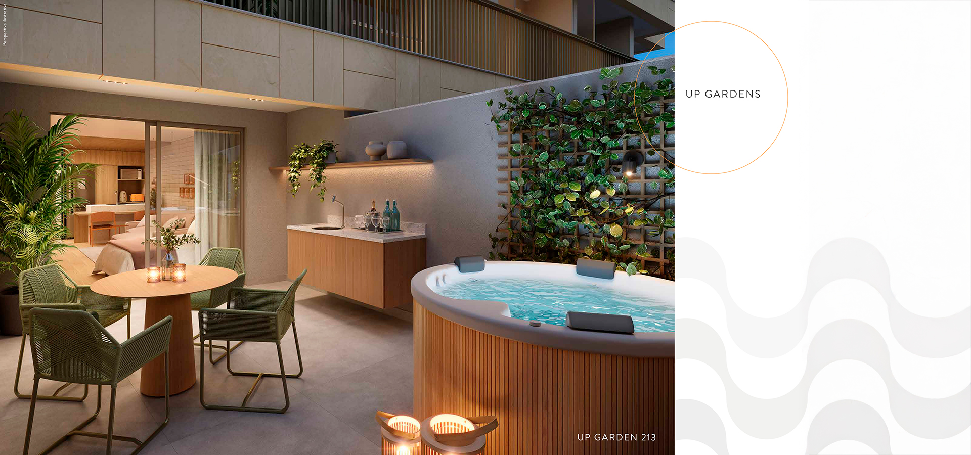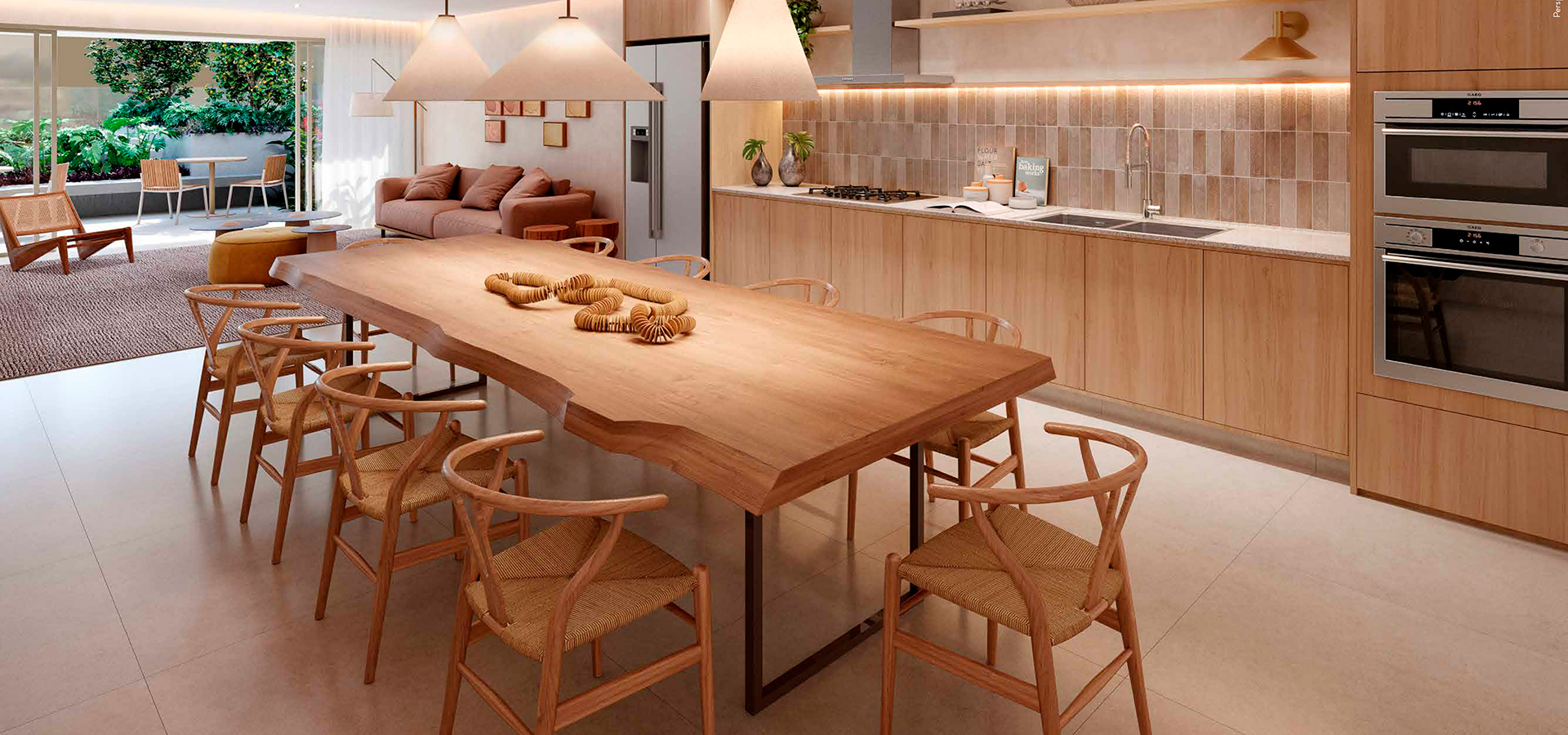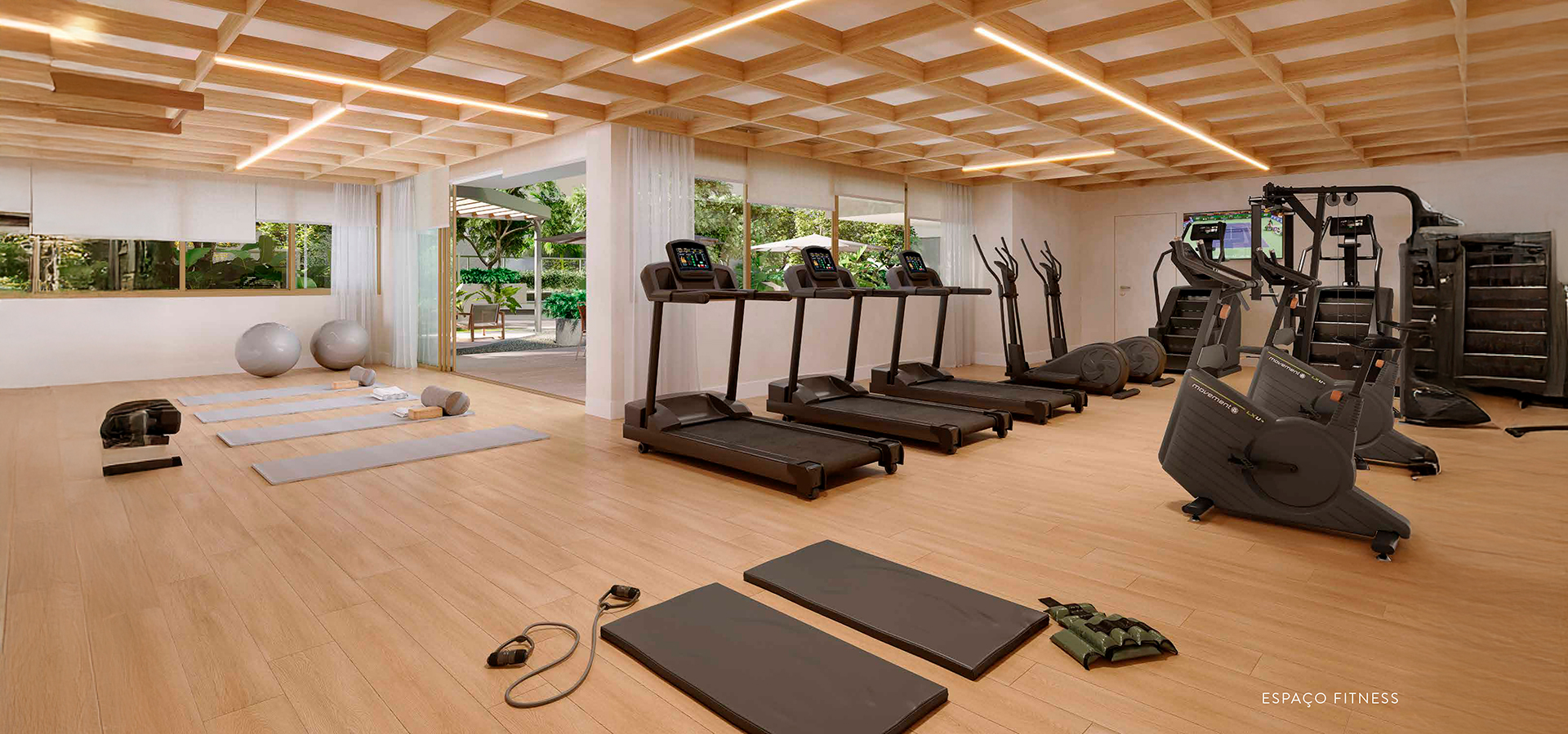 O paisagismo biofílico permeia os espaços, trazendo a vegetação tropical como elemento central e valorizando o contato direto com o verde e com a água.