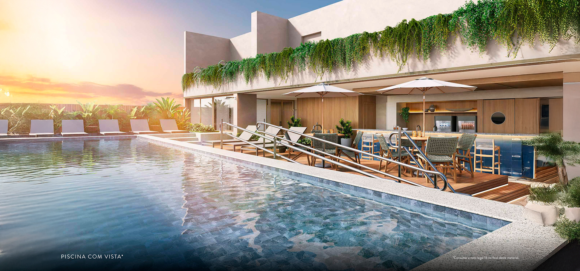 Espelhos d’água refletem a luz e o movimento, reforçando a sensação de leveza e bem-estar que guia toda a experiência do empreendimento."