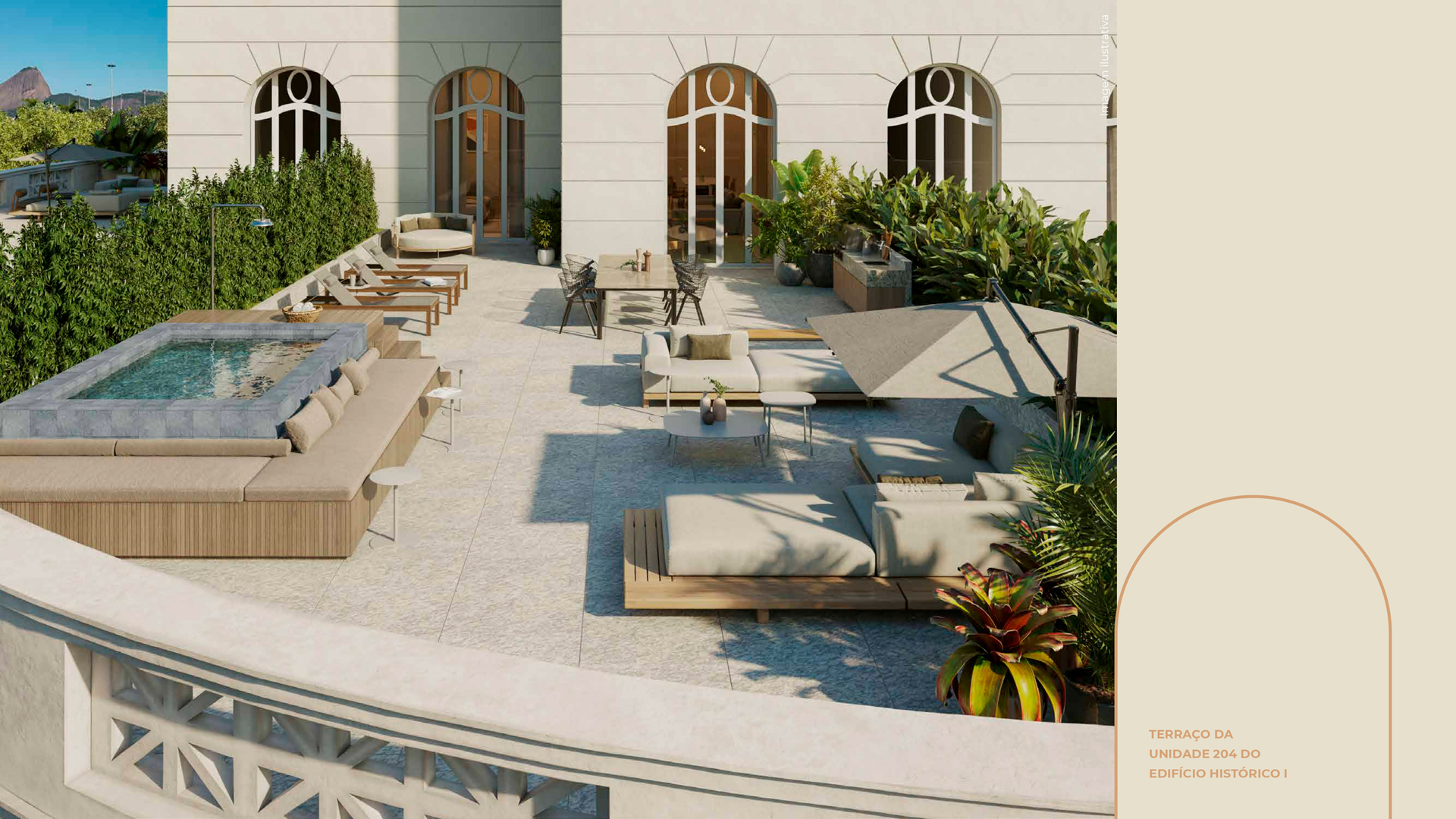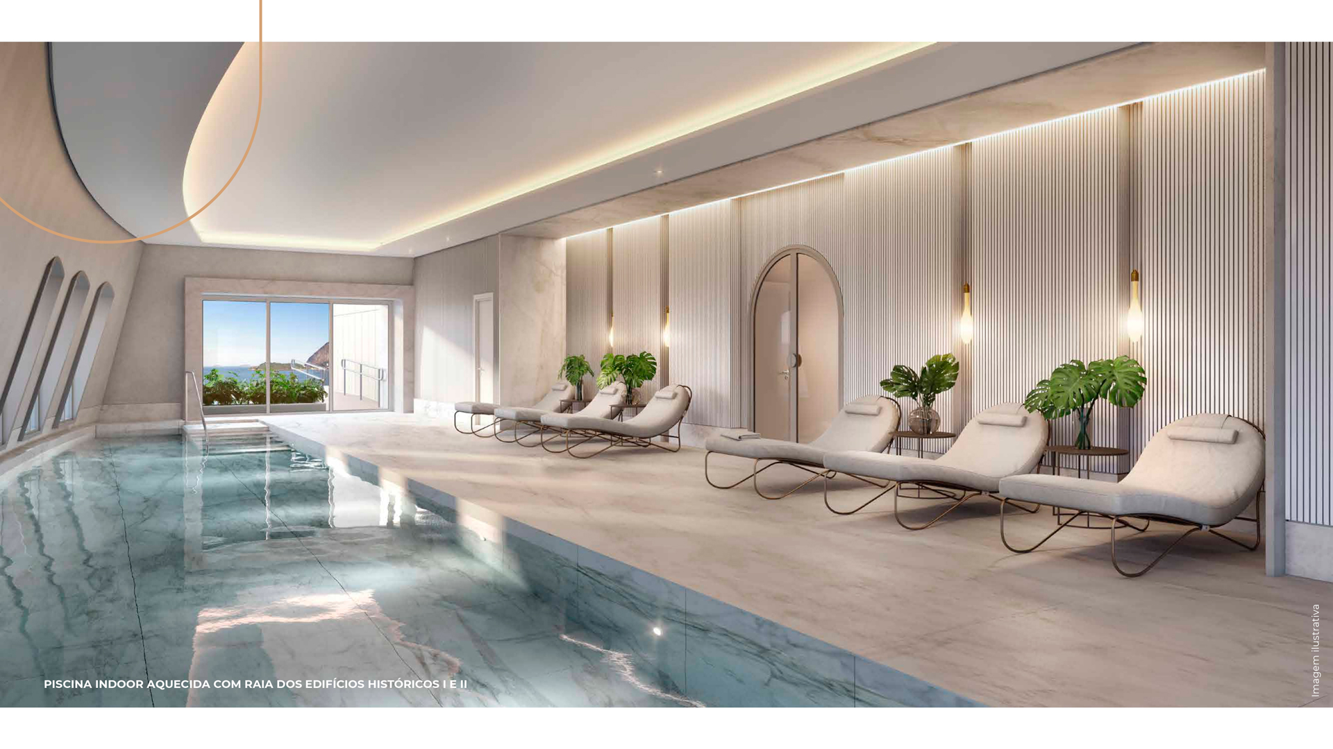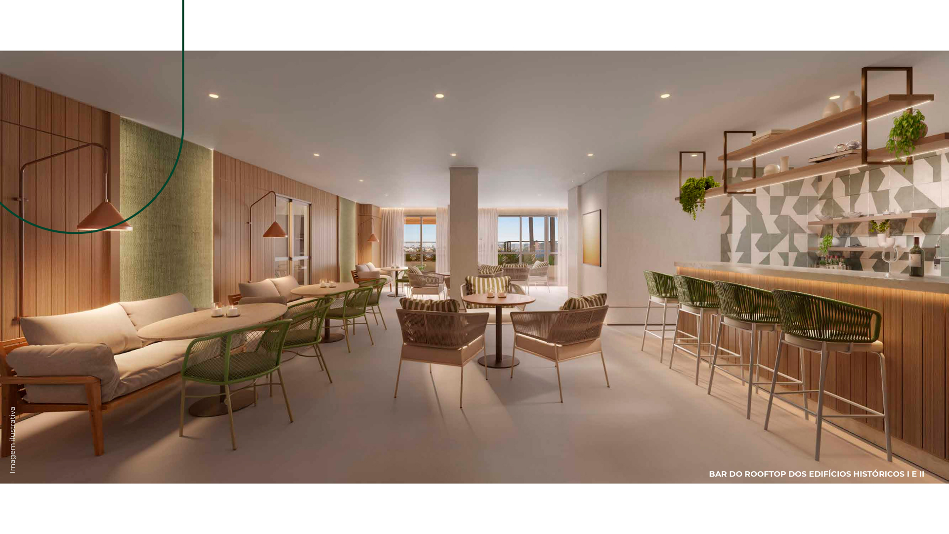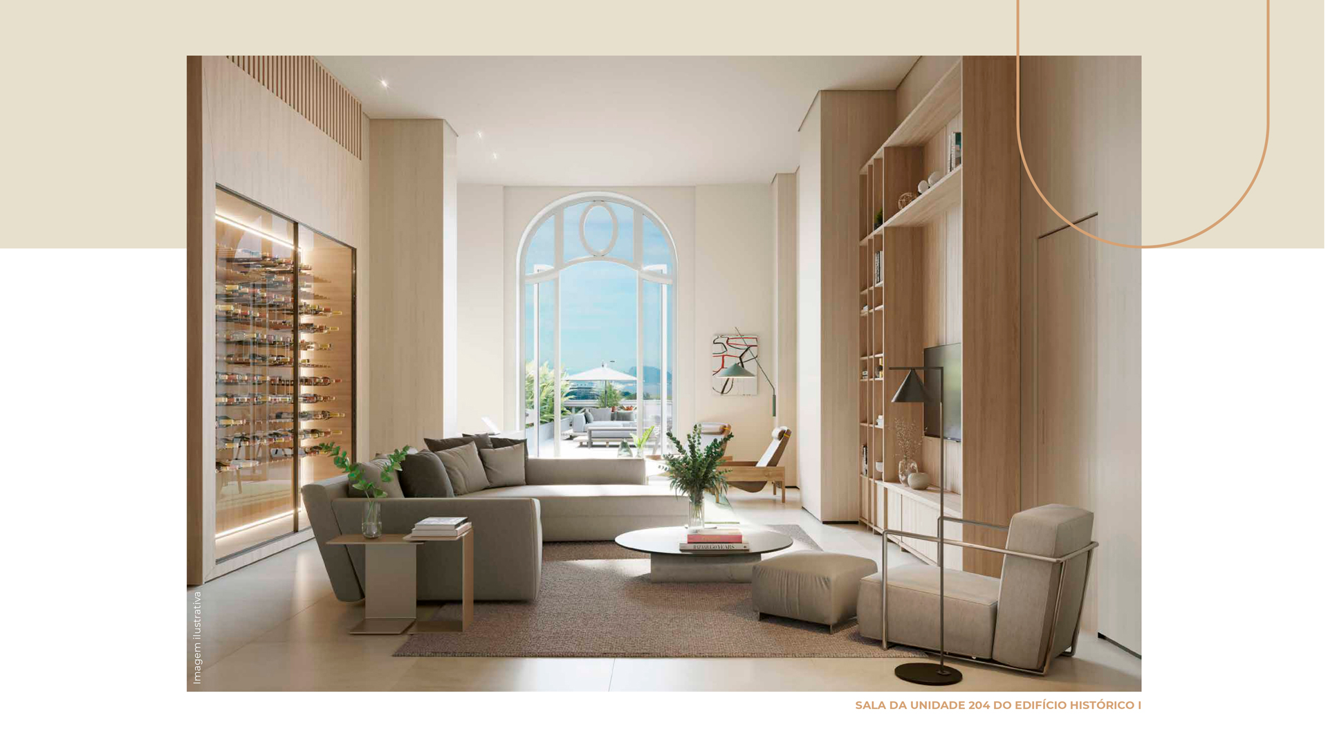 Para dialogar com as estruturas, dispomos de mobiliário em formatos orgânicos e sinuosos - apostando, principalmente, em sofás curvos - em um claro aceno à geografia da Cidade do Rio de Janeiro. A atualização dos interiores se dá na combinação do charme clássico com as peças de mobiliário contemporâneo nacional, texturas diversas e materiais naturais - como madeiras e pedras naturais brasileiras. Tudo isso arrematado com uma curadoria única de obras de arte contemporânea.